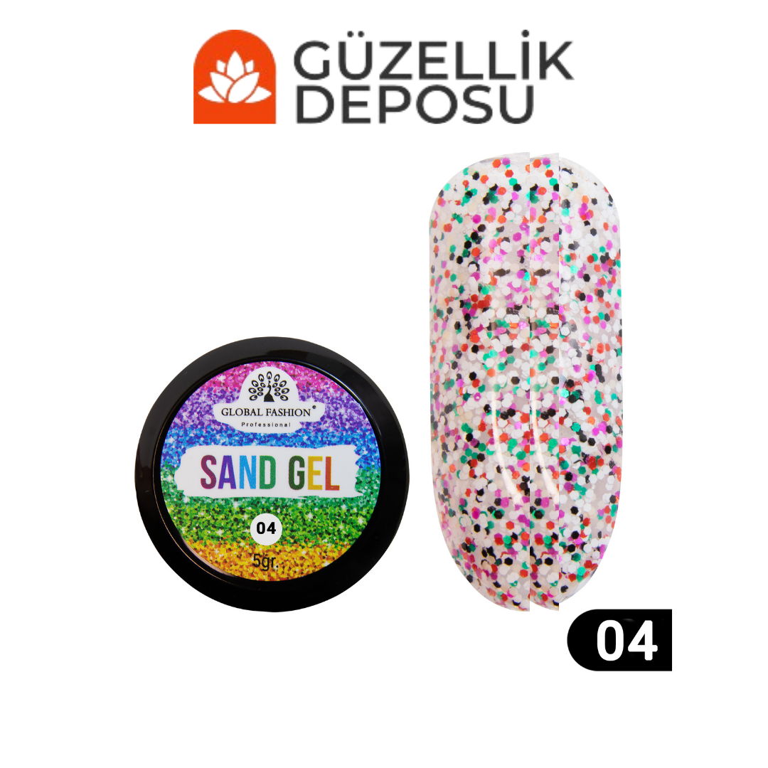 Global Fashion Sand Gel 04 (Kum Jel): Bu jel özel granül tanelerinden üretilerek, tırnak sektörüne yeni giren ve hızla büyüyen bir tırnak süsleme ürünüdür. Bu ürün son zamanlar da sıkça tercih edilerek yaz sezonunun ileri gelen popüler bir tırnak süsleme ürünüdür. Hemen ürünü inceleyerek satın alma fırsatlarını sen de yakala!